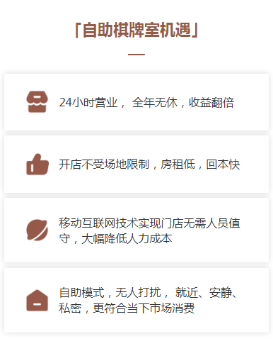 主打年轻人群的自助棋牌室,智能设备与棋牌室空间相结合,远离传统棋牌室脏乱差,打造出新型棋牌室休闲娱乐。